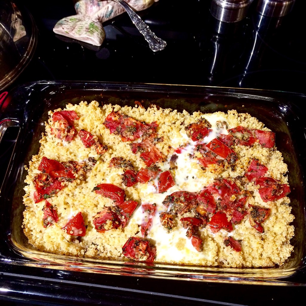 Spread 3 oz mozzarella cheese over meat. Spread 2 cups cooked quinoa over this. Then mix 3 eggs in separate bowl. Pour evenly over top. Put into preheated 350F oven.