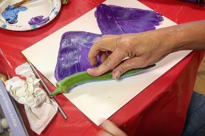 The art class was somewhat nonplussed when I suggested we use sweet potato slices to print or paint with, as well as the big pretzel rods. Gail brought some large okra from her garden too, so we added this to the equation. If we always draw with the pencil and fill in with the paint brush, we get paintings which resemble coloring books. Then they came up with some original solutions. I knew they had it in them!