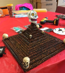 Michael worked on a pyramid of foam core boards, which he painted to look like stones. He decorated it with store bought skulls and a photo of his deceased brother. He has more nuts and bolts from a found object stash to add to it. Telling the story of his beloved one is part of the project. Art is part therapy and part project. We may work with our hands, but our hearts and minds are also involved.