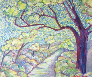 The trees of the finished work are more slender, more shaped by the wind of the Carolina coastline. The bush masses are larger and have more contrast, while the sky is more evenly colored. Even the path has more sunlight and less shade.