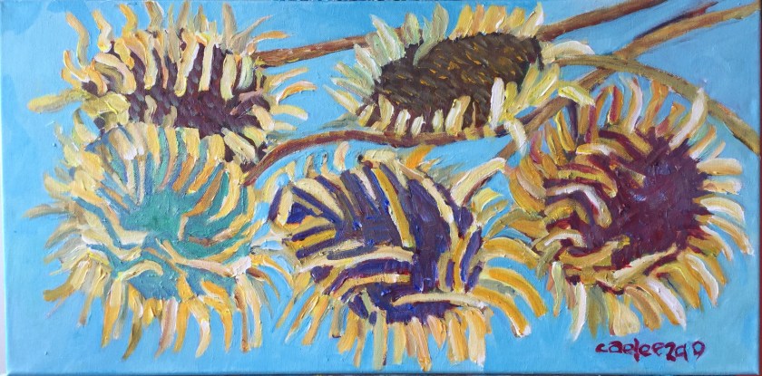 This is the season of sunflowers, and they bring light inside when we want to keep the shades down or the curtains drawn to keep the hot sun from cooking our dwellings and driving up our air conditioning bills. I’d bought some blooms to brighten my home and enjoyed them while I repainted my condo. They died during this weeklong endeavor. Afterwards I took a break from wall painting to do some canvas painting. I decided to paint the dying sunflowers.