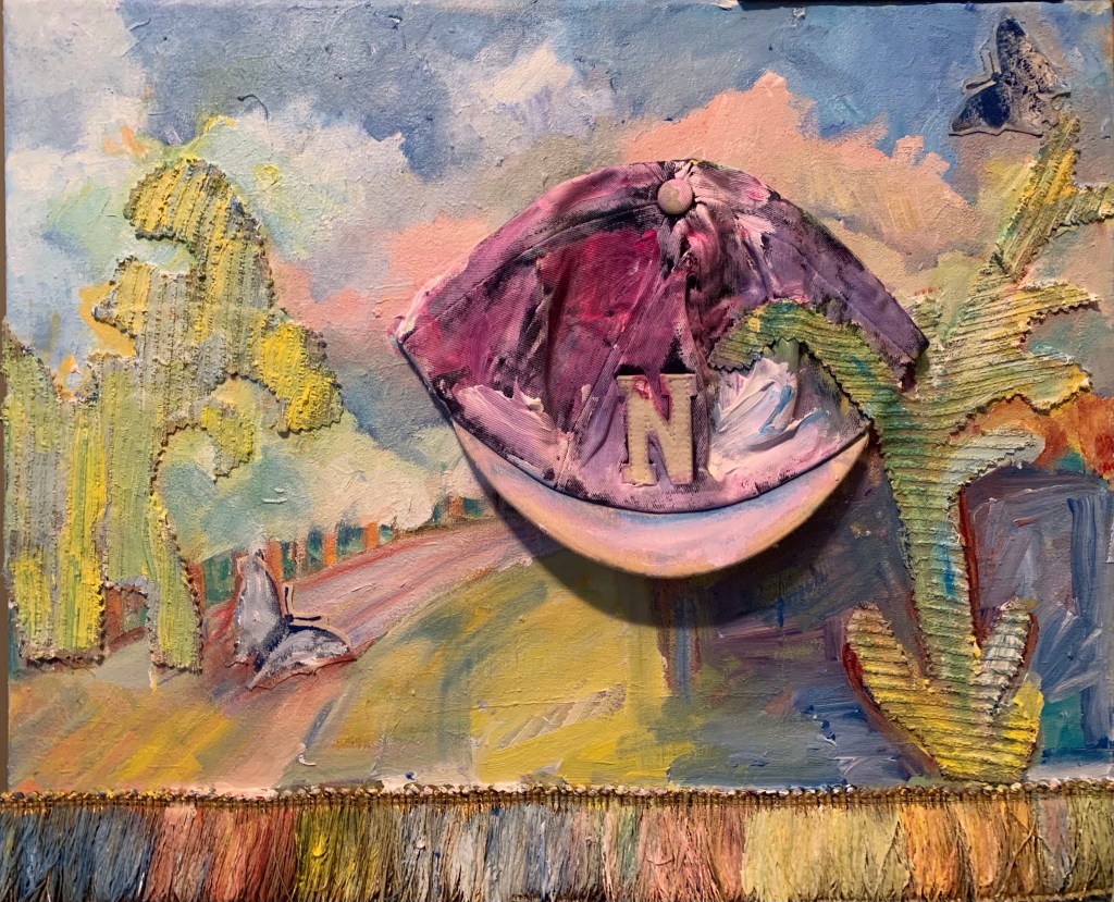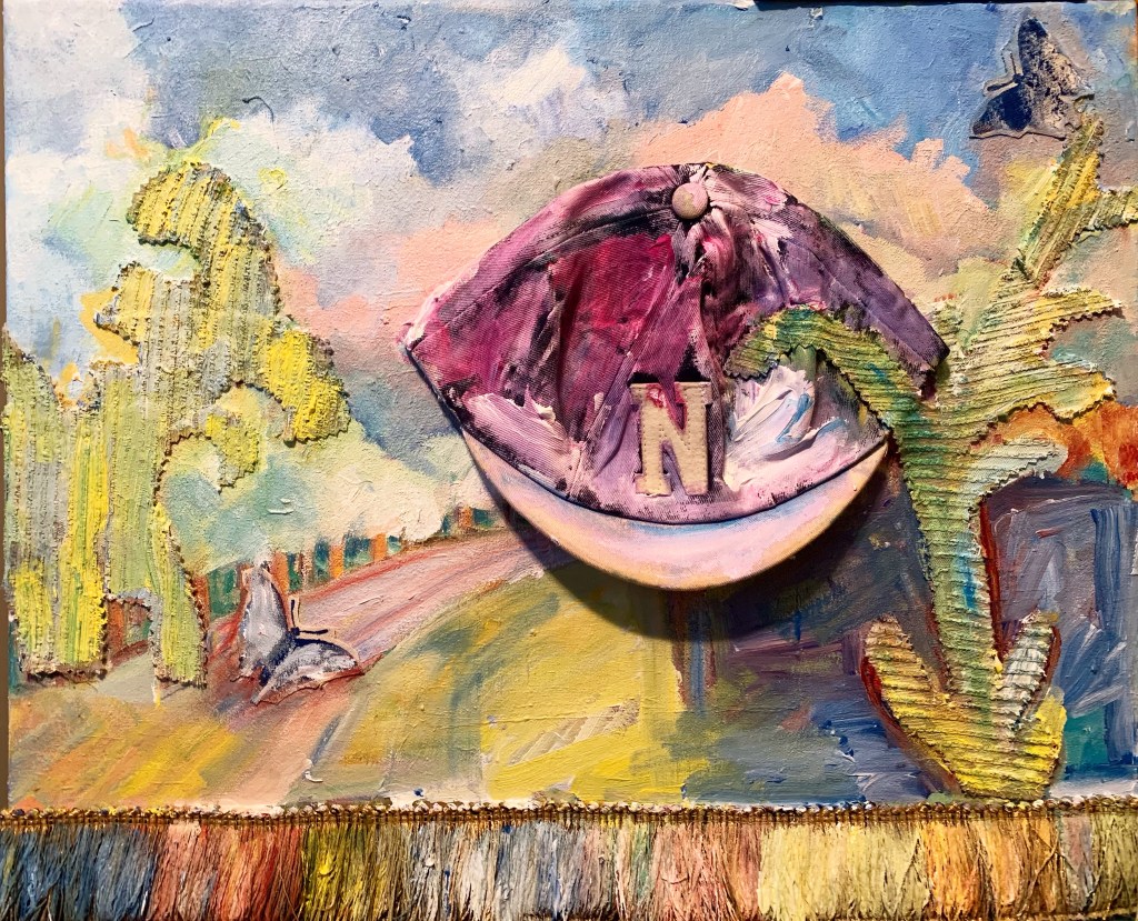 In my mixed media cognitive maps, I’ve kept the primary city streets, but selected only the geographic and architectural details which had meaning for me. I’ve used left over fabrics from the Covid masks I’ve made, old needlepoint seat covers from my parent’s garage, and antique crochet my grandmother made that she never sewed onto a pillowcase. I’ve often said, I’m going to “get around to it” and do something with these souvenirs from my ancestors, but this pandemic might not last that long. Also, I have other more pressing and exciting projects to pursue.