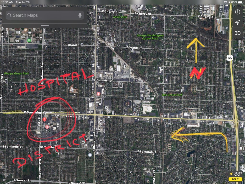 I usually get lost in a teacup, and my typical travel technique is to drive in the general direction of my goal and then circle it until I have it surrounded. I once drove to Springfield, Missouri to find the hospital there. Once I saw the blue H sign, I took the highway exit, and drove until I began to see a multitude of fast food shops along with drug stores and medical uniform shops. Once I saw physicians’ offices, I knew I was close. Then the height of the hospital building was unmistakable. I knew it would be located in this area, for my cognitive map of every city told me “this is how a hospital district is arranged.”