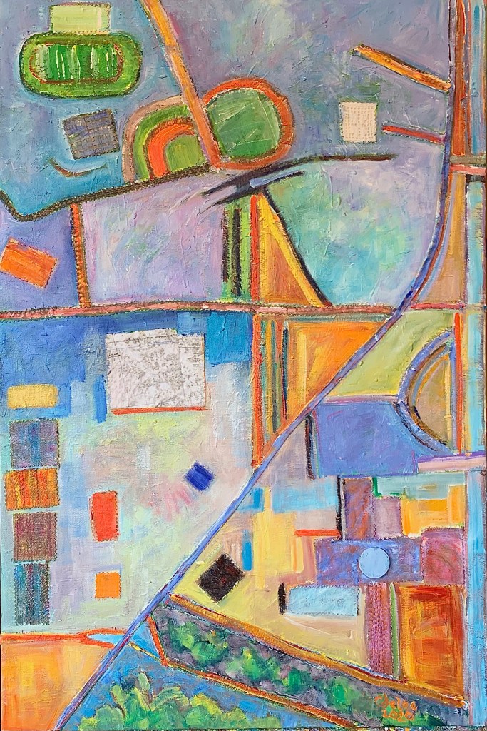 The pandemic has tossed my well conceived notions of how I live my life right out the window. Confined to my home, I longed to travel and to wander the city streets as I did in the days before Covid. While I had the grounds of my condominium property to explore, it wasn’t enough. When I began to look at the Google maps of the sites I’d painted before, I noticed I liked the patterns of the satellite views. Sketching out colors and shapes on the images saved from my iPad, I started making some preliminary works. Then I found some old paintings that no longer pleased me and began to rework them with maps of places which have meaning for me.