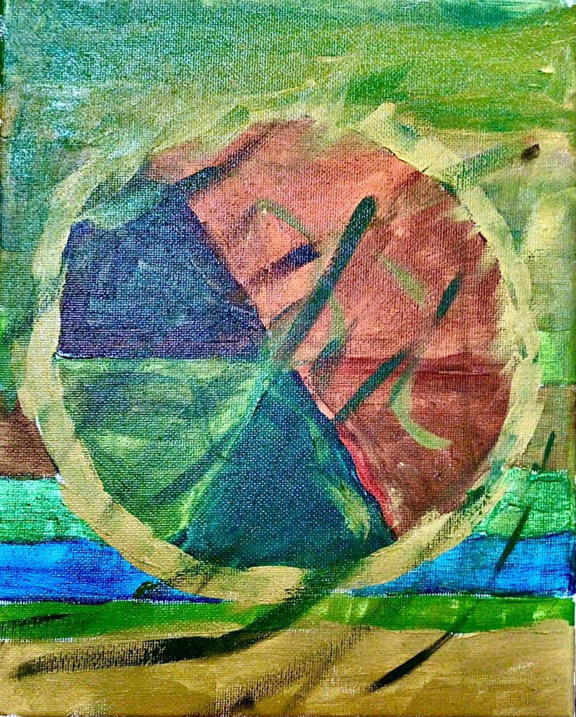 I wasn’t truly satisfied until I pulled the gold, silver, and bronze mix over all the whole surface. Only a few of the bright colors from the original under painting remained as key notes to bring the eye around the canvas. I think I might have to make more three dimensional areas in another work. This one doesn’t have quite enough.