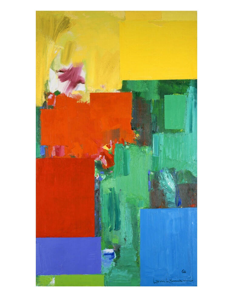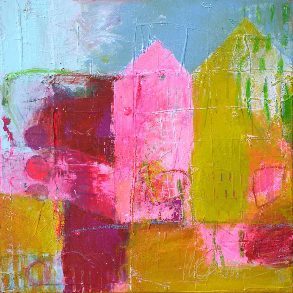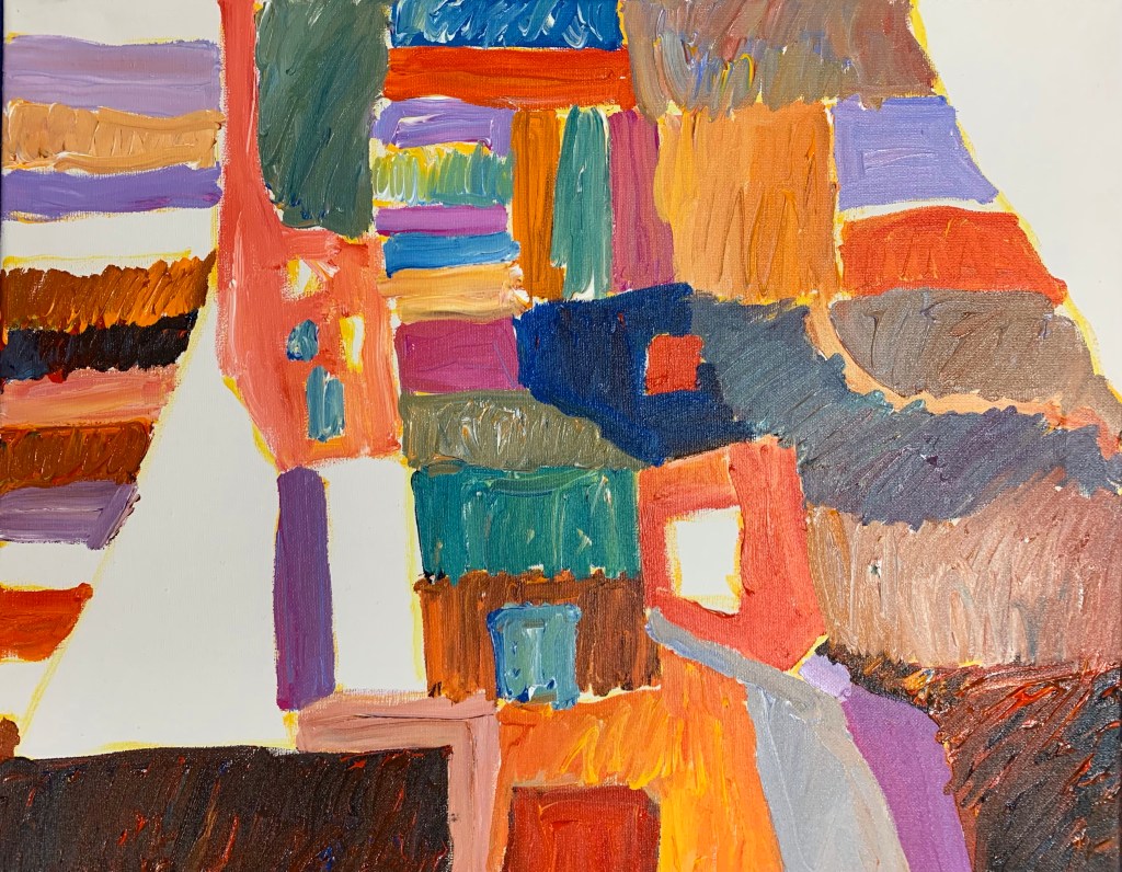 These brightly colored houses are the last layer of a heavily overpainted canvas. Underneath the house shapes with their gabled roofs, we can still see the faint images of rectangular buildings. The artist also scratched through the paint in places for texture and stumbled colors on top of other colors. This technique takes more time than two hours, since the bottom layers need to dry before the upper layers are added. The quality of paint is different also, since thin paint isn’t able to handle this type of work. It yields a much livelier and more optimistic image than the dark one above.