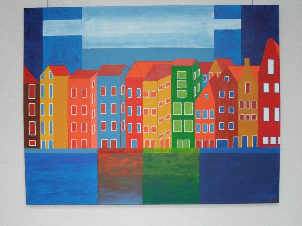This image has not only the brightly colored houses of a seaside city, but also their reflections in the water below. The sky is broken up into planes of various tints of blue. There’s three distinct sections: foreground, middle ground, and background. It’s located in a real space, even though it’s rendered in flat and decorative colors.