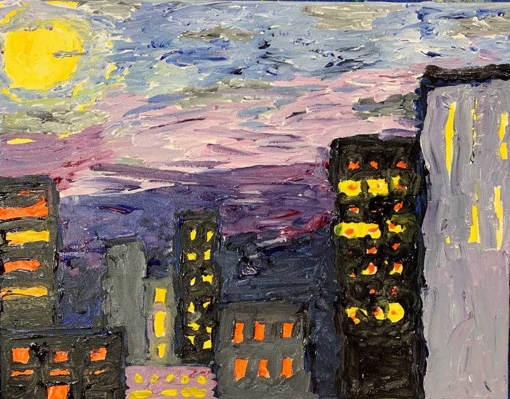 Making a painting has some of this same expectation and disappointment. In class we had the inspiration of “The City.” We don’t paint just the shapes, but also the emotions we feel about the subject matter. If we like the city, we’ll respond well, but if the idea of the city is distressing to us, we might not even be able to work at all. If I don’t have sufficient caffeine by 10 am, my creative juices don’t flow swiftly.