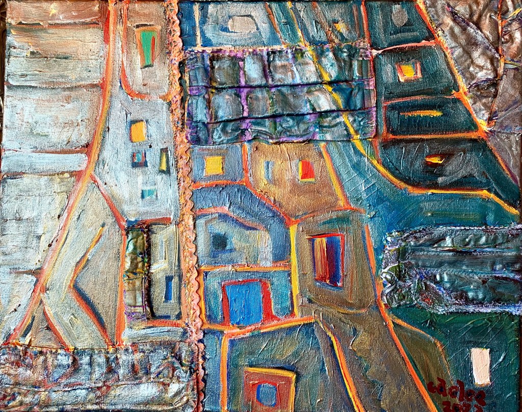 At home, after I recovered from a weekend of four exciting football games, I took several of my oldest fabric face masks, which are inadequate for our latest highly transmissible omicron variant. Abandoned masks are a common sight, joining the rest of the urban detritus that sully our city sidewalks now. I also added some of my grandmother’s crocheted rickrack for one of the main streets. I overpainted the bright colors with dark blue colors. Somehow rolling into the third year of this pandemic has sucked some of the energy out of me.
