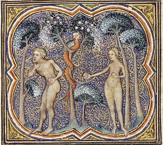Jean Bondel: The fall of man—Adam and Eve eat from the Tree of Knowledge of Good and Evil, 1372, illustrated manuscript, National Library of the Netherlands.