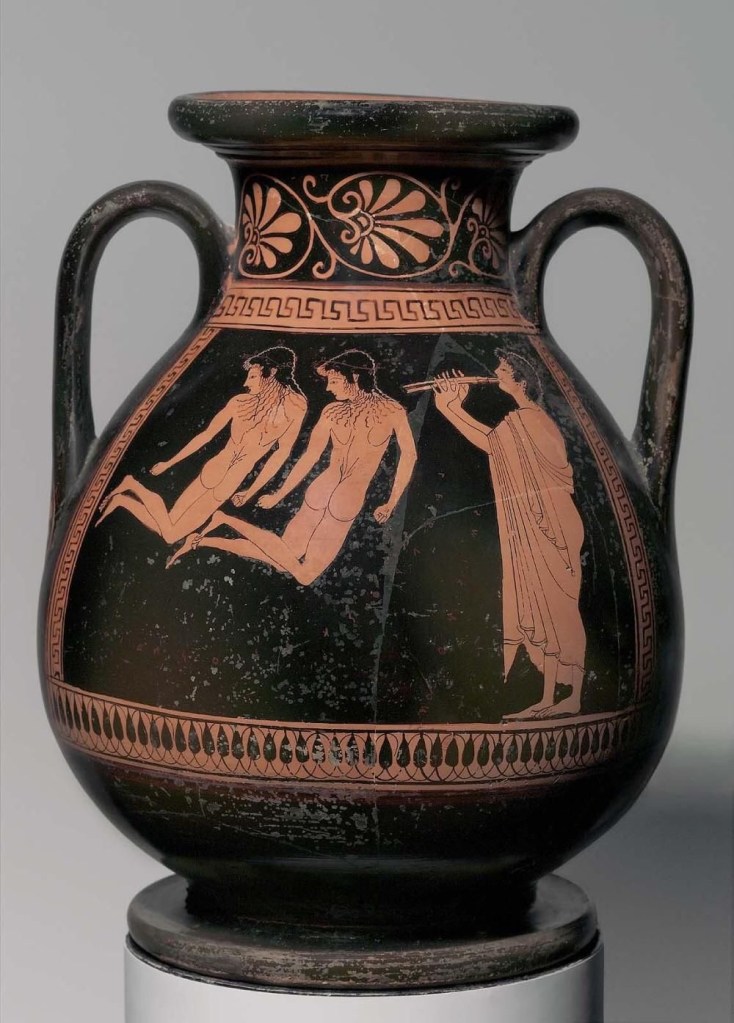 Two-handled storage jar (pelike) depicting young athletes jumping