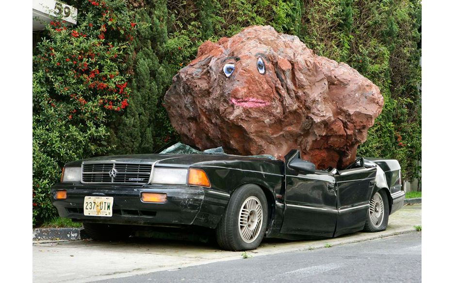 Jimmie Durham: “Still Life with Spirit and Xitle”, car being crushed by a volcanic boulder with a comical smiley face painted on it.