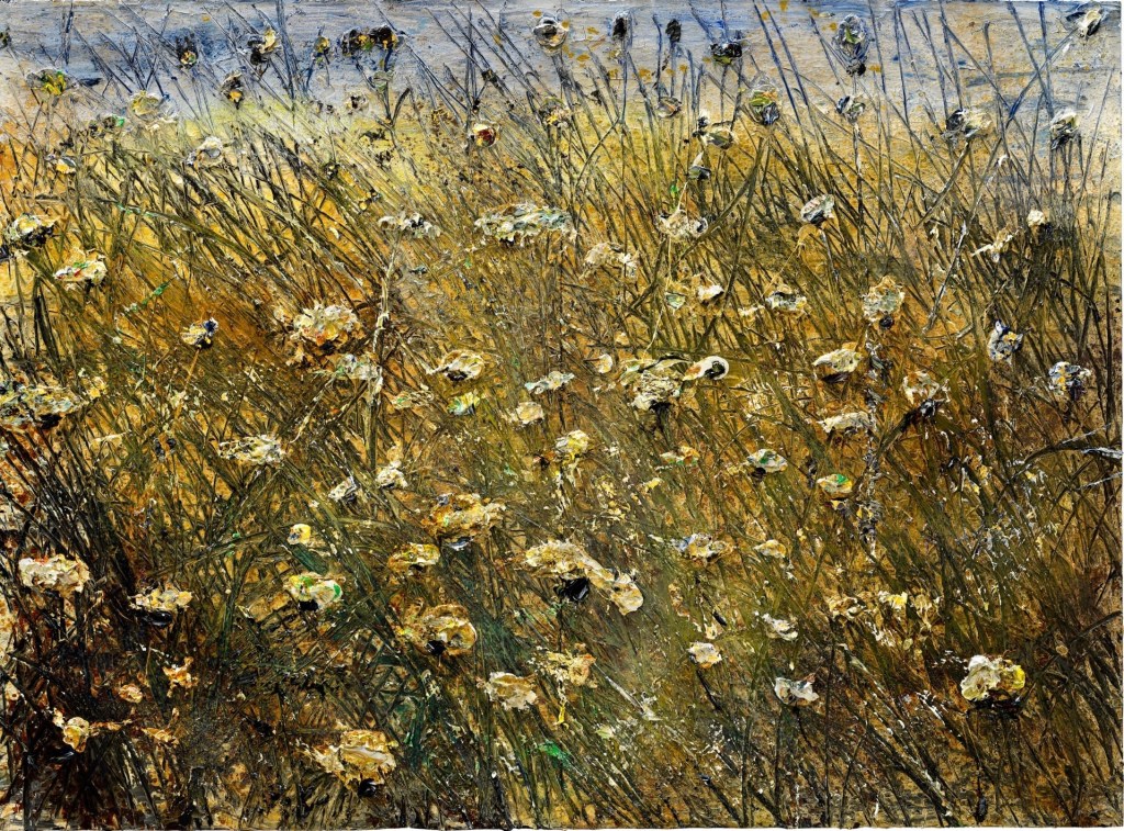 Anselm Kiefer: Feld (Field), 2019-20, Emulsion, oil, and acrylic on canvas, 110¼x149% inches (280 x 380 cm)