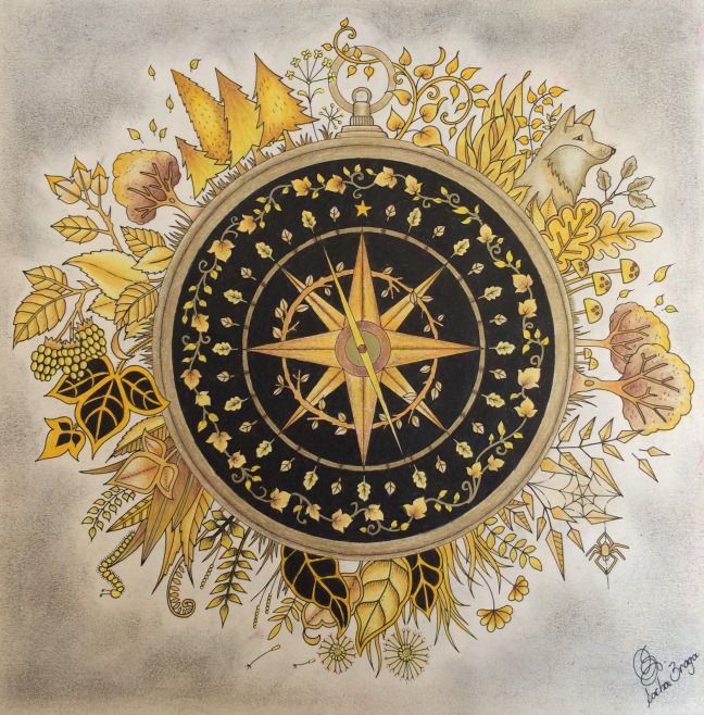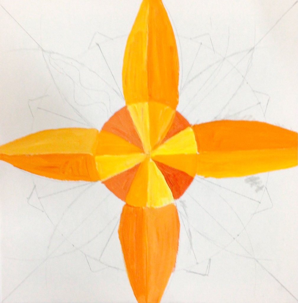 From one of the royal figures, Gail S chose one of the jeweled embellishments for her focus. Gail enjoys ordered designs, so finding an image with a regular pattern was right up her alley. The outer circle with an inner square is divided along the diagonals by red lines, as if the cross were tilted on its side. The circle and square give unity to the design, as does the monochrome cross. The triangles are balanced by colors. The outer blue rim holds it all together. Gail tried the watercolor pencils out along with the pan watercolor washes.