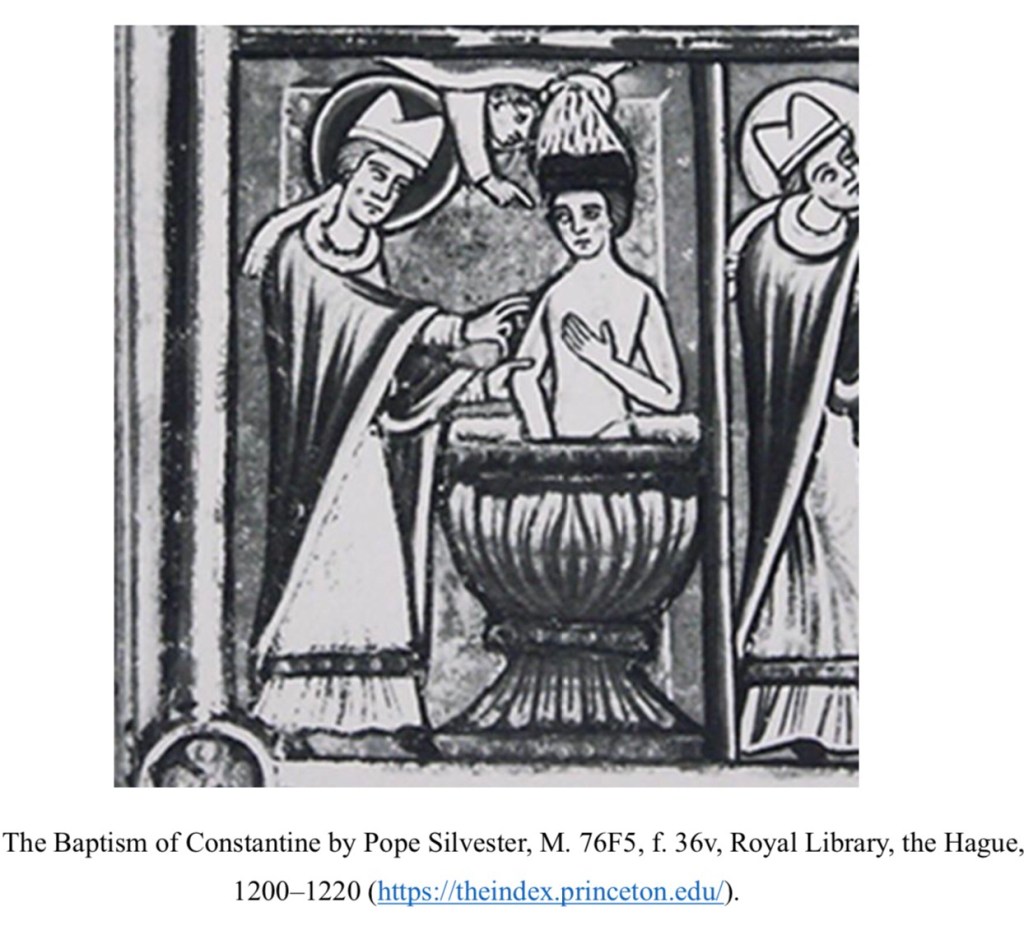 The visualization of St. Michael’s involvement in Constantine’s baptism has no direct precedent in Byzantine and Balkan iconography. Similar descriptions appear in the shorter ninth-century vita of the hierarch and in the lives of Constantine. In the “Guidi” legend, the emperor’s confession is specifically addressed to the pope: “Servant of God, as I was standing in [the water] of the holy baptism, I felt a hand touching me and cleaning the sickness of the flesh.”