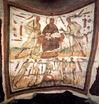This image of Christ on the Throne, dating to the 4th century, shows Michael between St. Peter and St. Paul. It was painted in the Catacomb of Sts. Marcellinus and Peter on the Via Labicana in Rome, located near a villa that used to belong to Emperor Constantine. Below the main figures of the painting—Jesus, Peter and Paul—we find Gorgonius, Peter, Marcellinus, and Tiburtius, four martyrs who had been buried in that catacomb, and are depicted as they point to the Lamb of God on his heavenly altar.