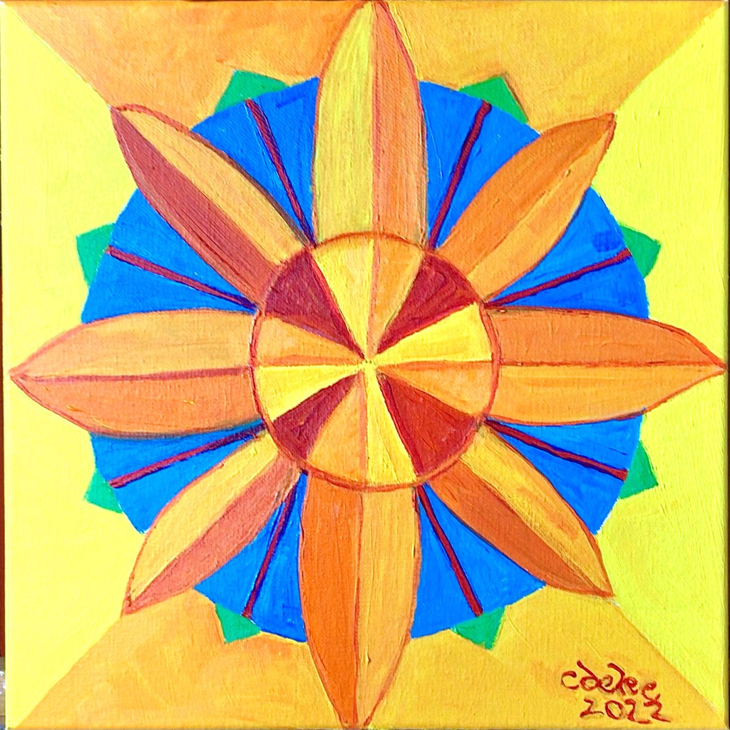 Half our class has been doing the color wheel multiple times, while the other half is getting their first exposure to it. Gail and Mike have made enough color wheels that I would not ask them to make another unless we changed our medium. Then it is always worthwhile to see how a new set of colors behaves when mixed. I gave them the guide, “Choose any design you want, and mix up the colors to make an interesting design.” Of course, they are two different personalities, so they produced two different paintings.