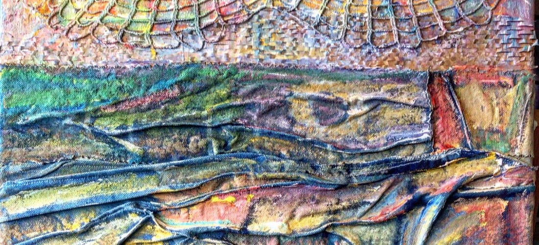 I made this second creation painting during this healing time by intuitively wrapping strings around the stretched canvas. Then I took assorted sizes of plastic lids which I couldn’t recycle, but I was “needing to find a use for them” before I relocated them to the trash heap. I belong to the generation of “waste not, want not.” (Yes, my nannie had the famed ball of string and one of tinfoil also.)