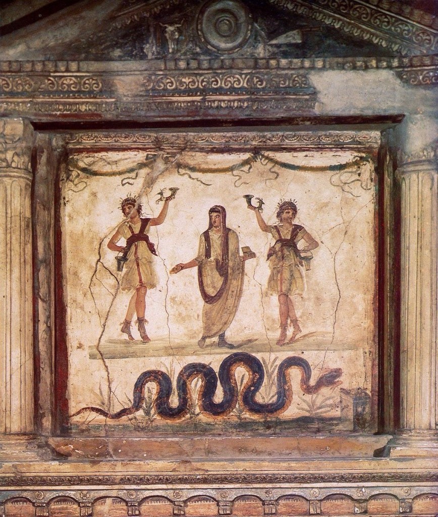 The genius is a Greco Roman idea like our guardian angel, in that each person has a guardian spirit. The Romans put the father at the head of the family, so the genius was the spirit of the male head of the household. In the family altar areas lares, (guardians of the family, who protect the household from external threats) stand on either side of the genius, who wears a toga and makes a sacrifice. Beneath them all is a serpent. The murals often depict snakes in the lararia because the Romans believed they were also guardian spirits of the family and as well as messengers to the underworld.