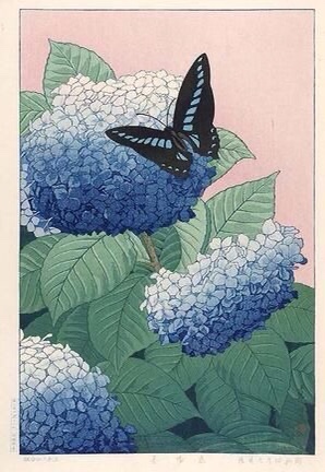 Inuzuka Taisui: Butterfly and Hydrangea, 1930, Woodblock print