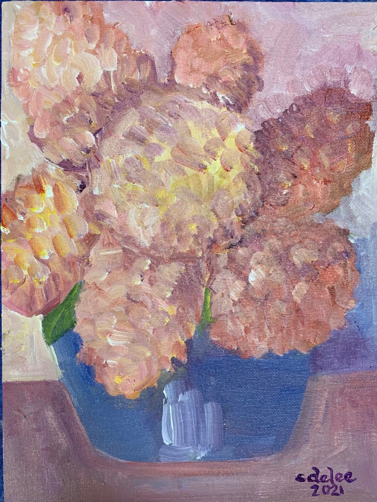 I found this painting on Pinterest. I pointed out how the artist didn’t paint every single flower petal, but still got the message of “hydrangeas” across. This is a palette knife work, so it builds up the shapes from back to front. An artist can’t just throw paint on the canvas like some piece of spaghetti against the wall and hope it sticks. We always have to put our thinking cap on and build up the shapes from back to front and from dark to light. We also have to pay attention to the direction of the light if we’re doing a realistic image.