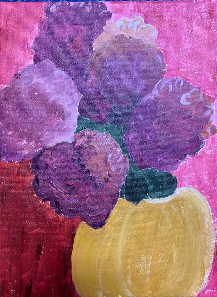 I noticed we each gave our flower pots a different look when we painted our canvases. None of us are dedicated copyists. My color scheme tilts toward the red-orange, yellow-green, and blue-violet. This is a secondary triad, rather than a primary triad of red, yellow, and blue. The mixed colors give the flowers their muted look.