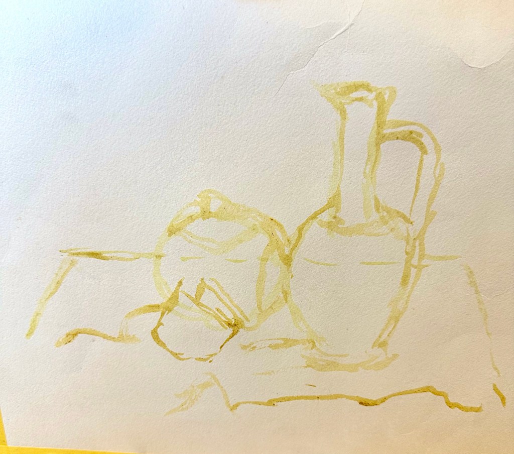 Measure twice, cut once. This is similar to the above sports metaphor. I learned it in the art school wood shop when I was cutting wood for my stretcher strips. Using the thumb or a brush to note the proportions of the still life objects and comparing them to the proportions of your own work helps get an accurate drawing. Check once, measure, check again, measure, and then cut. Air drawing or visualization helps to imagine the proportions before drawing the lines. Drawing lightly so you can draw over the less appropriate shape is an example of measuring twice, and cutting once.