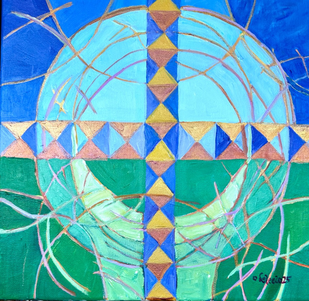 I had started my small canvas the week before when I was half sick. My hand, heart, and mind never feel quite connected when I feel bad, but I still work anyway. The beauty of acrylics is I can paint over them later. In fact, this is a repurposed canvas. If a work does not “speak to me” after a few months, I either cut it up to reweave it or paint it over entirely. I always think I will find hope for it in another form, but it may need to take its own journey to find its best self.
