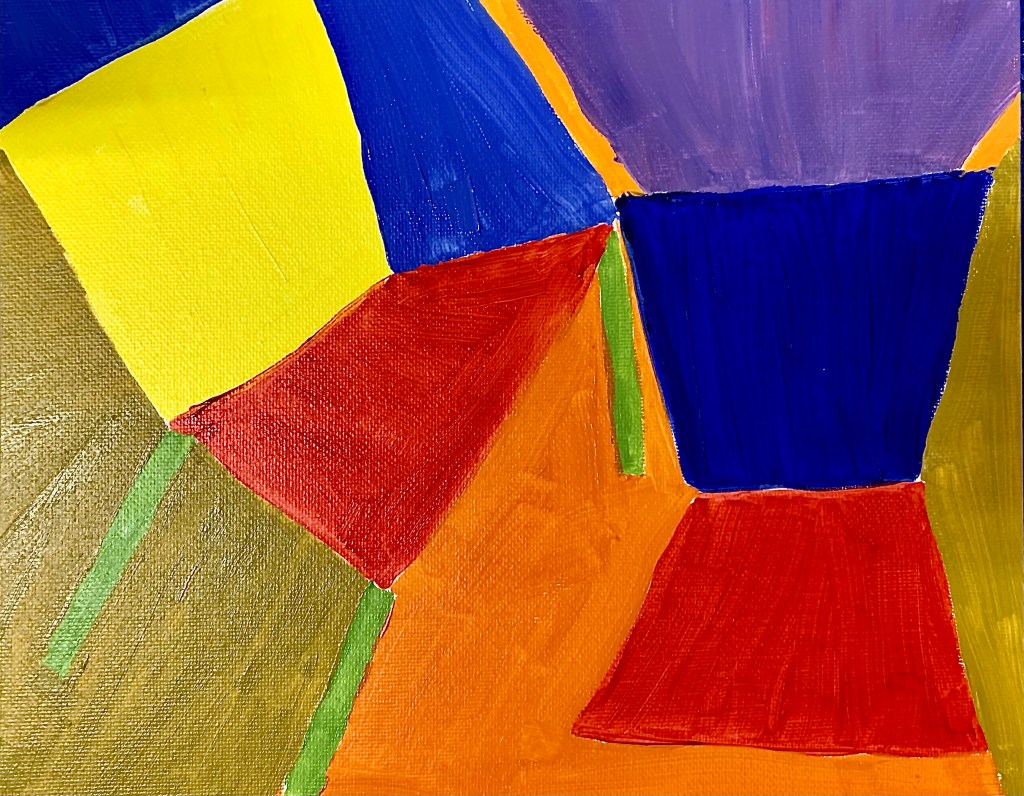 Gail divided up the canvas into various planes of colors, which sing for joy. I think she had fun. As the only one of our group who took the challenge of the entire scene, Mike took a bird’s eye view of the table and chairs. I hear he may be traveling again, or at least yearning to fly away from the day to day grind of full time work to something closer to retirement.