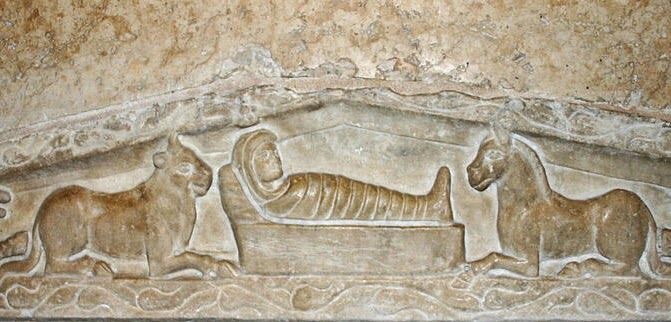 Carvings on the front of the Marcus Claudianus sarcophagus include: Arrest of Peter, miracle of water and wine (with a possible baptism reference), an orant or praying figure, miracle of loaves, healing a man born blind, prediction of Peter’s denial, resurrection of Lazarus and supplication of Lazarus’ sister.