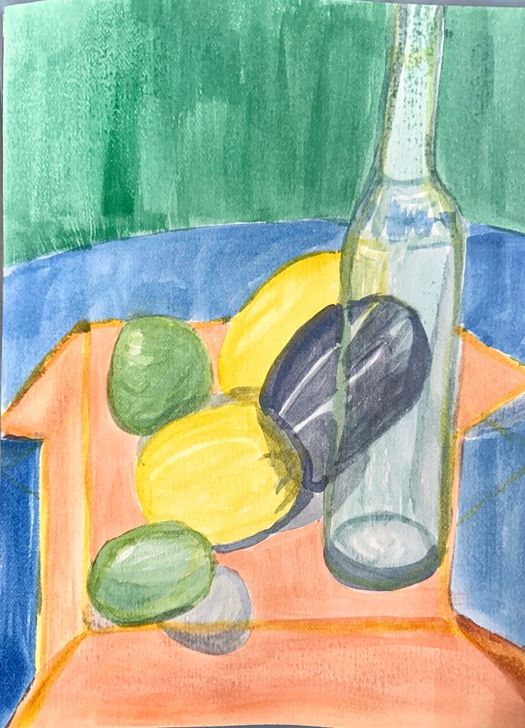 Gail W. paid attention to the still life and took care to lay down a close image in a pale wash before she began to add darker washes of color. Her left lime is most successful, with at least six shades of green and yellow in the shape. I also like the highlight on the central lemon. These two images capture the essence of the watercolor medium. Her perspective on the bottle bottom indicates it sits well on the cloth.